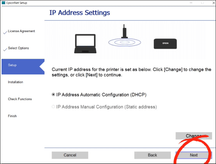 Bước 10 : Tích chọn vào mục DHCP nếu chọn ip tự động, nếu muốn setup IP tĩnh cho máy in thì tích vào mục static address –> Next.