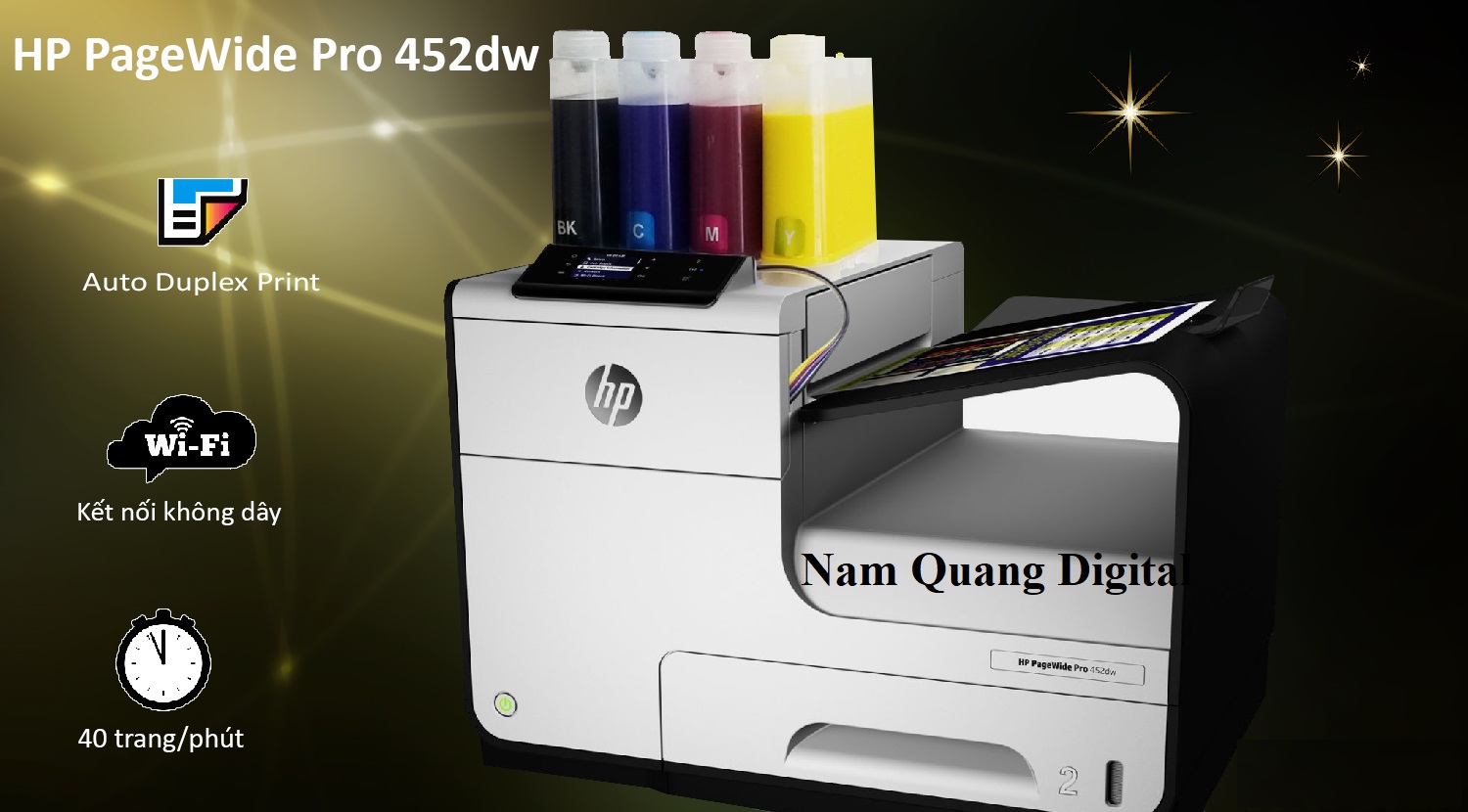 - - Máy in phun HP PageWide Pro 452DW được HP tung ra thị trường với việc sử dụng công in nghệ mới nhất. Với công nghệ PageWide, chi phí cho một trang in màu giảm tới 50%. Ngoài ra, nhờ sử dụng đầu in cố định nên chi phí bảo trì thấp hơn, tiết kiệm tới 85% điện năng tiêu thụ, thân thiện với môi trường, nâng cao khả năng sẵn sàng vận hành.